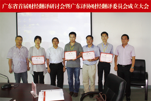 学术交流过后,我协秘书长陈定刚博士向与会人员介绍了我协的基本情况及我协今年上半年的工作成果。在简单地介绍委员会设立情况后,由陈定刚博士宣读理事会决议,委任广东技术师范学院外国语学院院长贺显斌为主任,立信羊城会计师事务所注册会计师余惠娥、广东金融学院外语系副主任黄中习、广发银行翻译业务总协调宋文娟为副主任,我协副会长钟书能教授、肖坤学教授为其颁发聘书并合影。