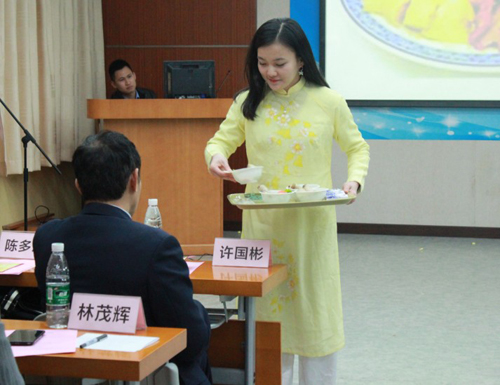 将结业典礼推向高潮的是学员们自编自演的精彩节目,包括三个小品《三非收网行动》、《警视直通车》、《越南好声音》以及诗歌朗诵《思念母亲》。培训班在短短10个月内取得的越南语学习效果,让不少本科生自愧不如。节目表演期间,为展示越南文化,培训班的女学员们身着越南传统服饰奥黛,端上了亲手做的越南特色小吃春卷和越南咖啡给在场的领导和师生们品尝。