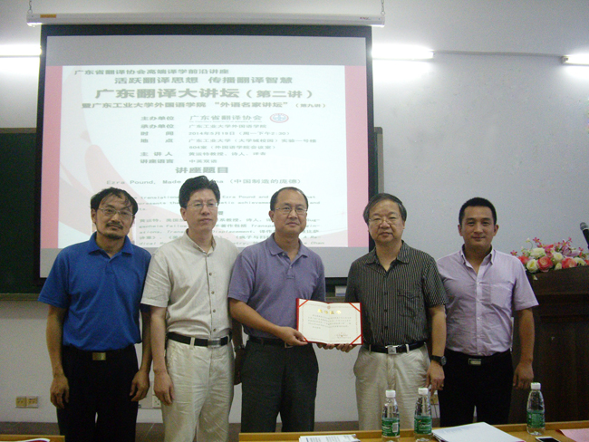 2014年5月19日,伟德网登录高端译学前沿讲座“广东翻译大讲坛”第二讲在广东工业大学外国语学院举行, 本次大讲坛由伟德网登录主办,广东工业大学外国语学院承办。美国加州大学黄运特教授与来自全省20多个高校、翻译服务及培训机构的100多名代表分享他的研究成果《中国制造的庞德》。我协领导、广工外国语学院院长蒋澄生教授代表广工外国语学院致辞、中山大学翻译研究中心主任王东风博导代表协会致辞、南方医科大学外国语学院院长唐伟胜教授作总结。本期大讲坛由协会秘书长陈定刚博士主持。