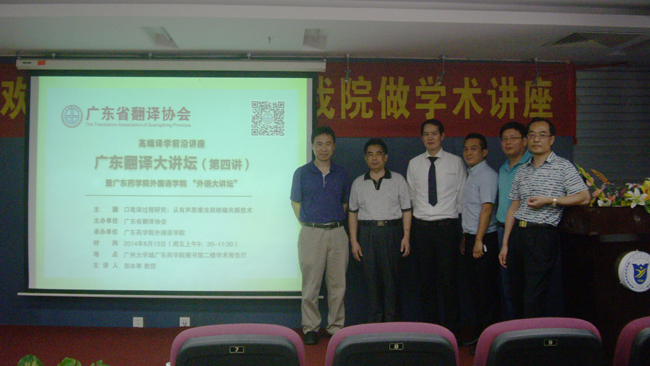 2014年6月13日,伟德网登录高端译学前沿讲座“广东翻译大讲坛”第四讲在广东药学院外国语学院举行, 本次大讲坛由伟德网登录主办,广东药学院外国语学院承办。来自全省10多所高校的专家学者、翻译服务、培训机构及广东药学院外国语学院师生等200多名代表与会。