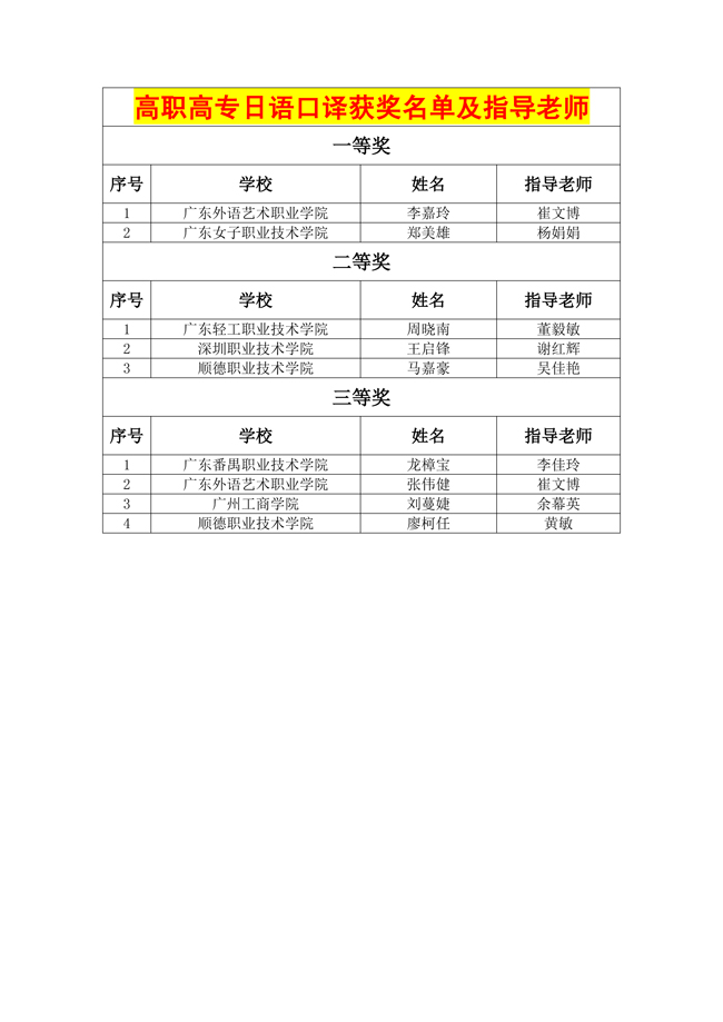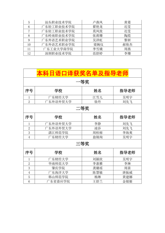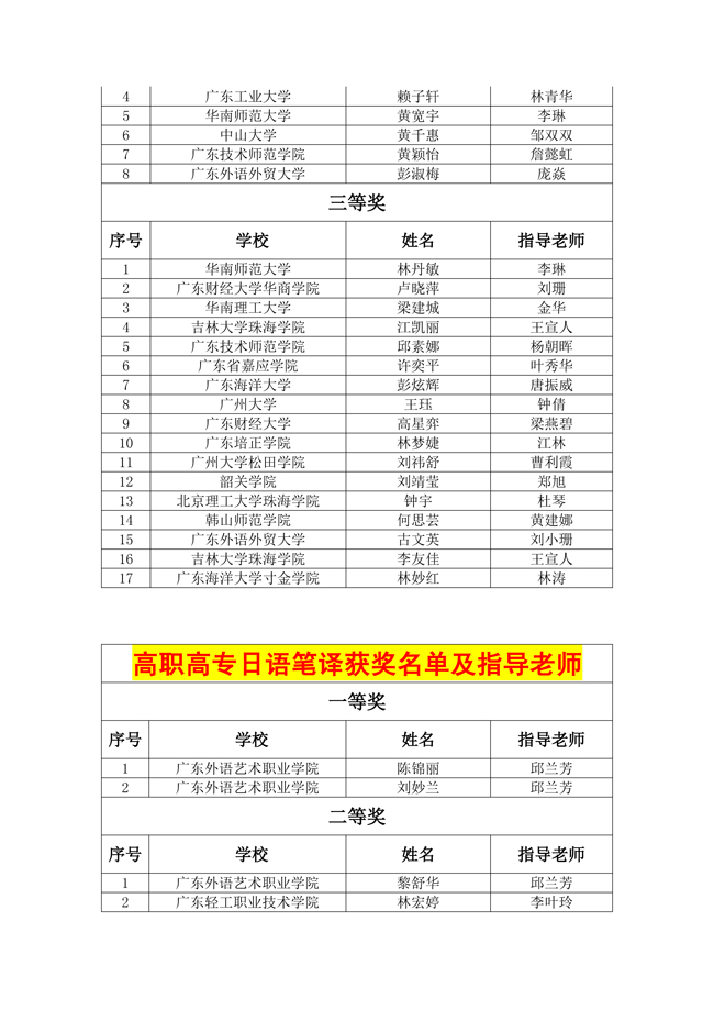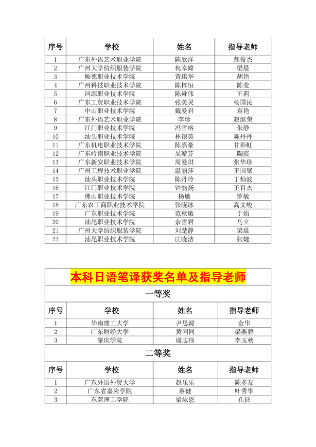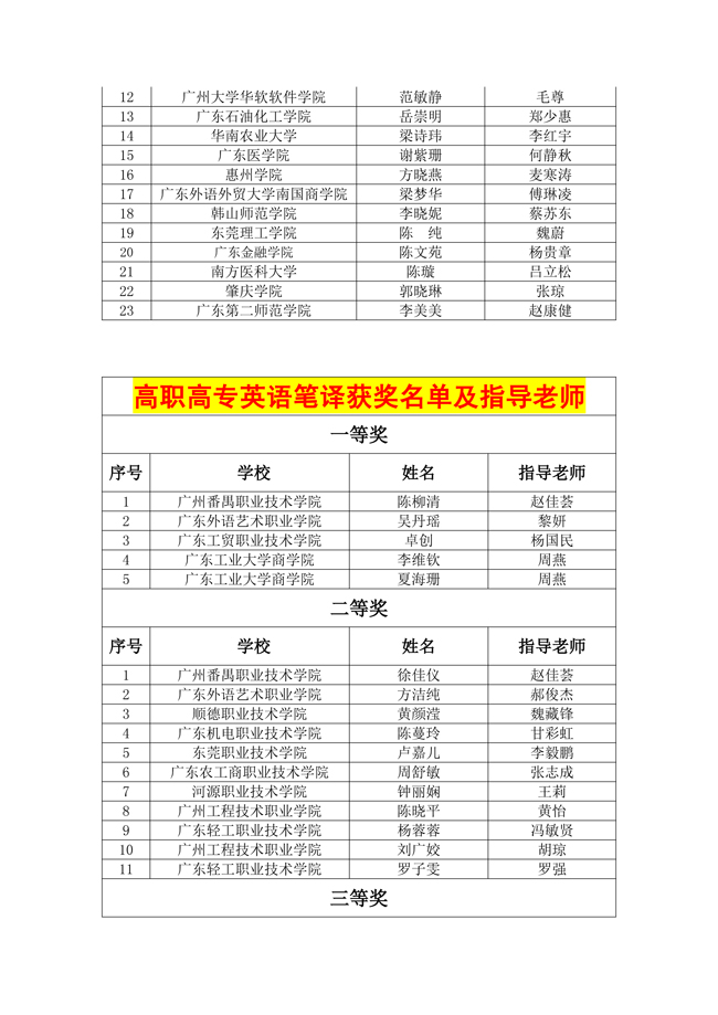 第五届广东大学生翻译大赛获奖名单及指导老师
