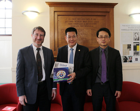 11月23日上午,仲伟合访问牛津大学(Oxford University)。他首先访问牛津大学最年轻的St. Catherine College,与院长Roger Ainsworth教授就学生交换项目进行了愉快交谈。随后,仲伟合在Jesus College与牛津大学“牛津展望计划(OPP)” 主任王世东主任、学术主任Ben Clyde博士等就下一步深度合作进行深入商谈。双方同意2016年初在广外设立OPP华南地区办公室,以该办公室为中介,广外将与牛津大学在学术与管理培训、高端学者访问、学生交流等方面展开合作。中午,仲伟合等与Worcest College教务长Scott Scullion教授、Micheal Mayob博士进行午餐会。经过洽谈,Worcest College有望每年接受广外1-2名英语或商务英语专业学生到该学院访问交流。