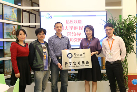 4月20日下午,暨南大学翻译学院陈毅平副院长、办公室主任田娟、翻译中心副主任李春一行前往珠海市平和语言文化培训学校(以下简称“平和英语),代表翻译学院与平和英语签订了校企合作框架协议,并举行 “暨南大学教学实习基地”授牌仪式。平和英语青少年种子培优运营总监Siegfread Cheng、平和英语村市场部高级经理Fancy Fang等进行了接待。