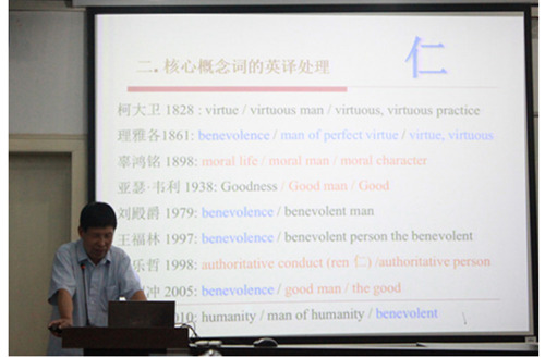 吴老先生首先向大家介绍了他个人典籍英译的原则“Know and let know”,即“自己懂,然后让人懂”。他以翻译“自求多福”为例,向大家阐释了好的翻译需要考证、查阅前人注释,汲取后人研究成果以及存储足够的古代知识;接着,吴老先生讲到核心概念词(如:仁)的英译处理技巧,他认为盲目求信未必信,深知文意方可达,兼顾气势定俗雅。