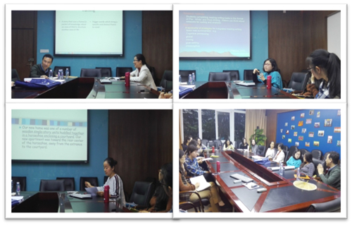 第三位进行发言的是谢林静老师,她选取的主题是“通过以读促写的教学模式来指导二语学习者”。谢老师首先向大家介绍了她在教学上的“以读促写”的具体实验。先让学生阅读被截取了结局的文学作品,后让学生分组讨论,再让学生将讨论出来的想法续写成结局。通过这样的方法,不仅得到学生的积极反馈,学生对课堂也提高了热情度。接着,谢老师阐述了现今中国学生的写作情况,同时还分析了雅思及大学英语等级考试的结果。这些结果都表明了,中国学生的英语写作能力让人堪忧。然后,谢林静老师还从写作的角度,及阅读的角度对“以读促写”的模式进行分析。最后,解老师强调了,“以读促写”模式与单独的阅读模式和写作模式均不相同。谢老师发言后,大家踊跃发言。宫老师针对“以读促写”模式展开了讨论,并表示对“以读促写”模式的认可,同时提出了阅读输入对于写作输出的重要意义。其他老师也围绕这一此话题展开了讨论,认为可以通过研究中国学生写作中出现的问题发现一些错误类型可帮助英语写作教学。