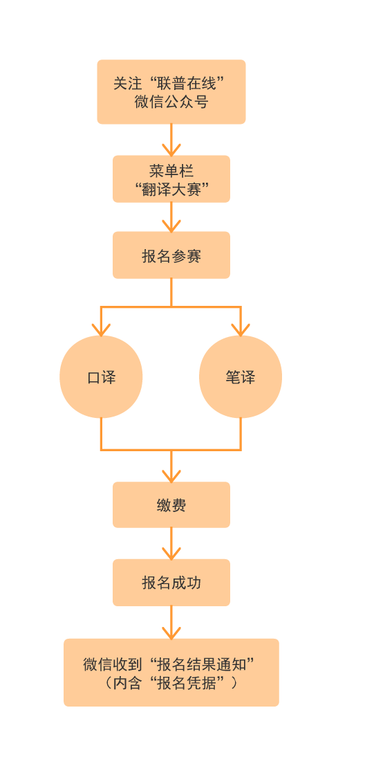 关注“联普在线”微信公众号→“翻译大赛”→“报名参赛”→选择笔译、口译项目。缴费报名成功,获得参赛资格,微信收到“报名结果通知”(内含“报名凭据”),每次报名只收到一个报名凭据,每个报名凭据只能提交一个比赛项目,如参加两项,须报名两次。重复报名,取最高成绩作为比赛结果。