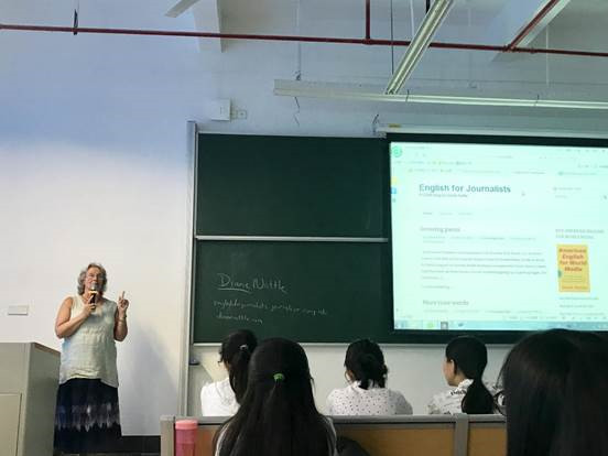 2019年6月17号下午,前纽约时报编辑、暨南大学客座教授Diane Nottle女士赴暨南大学番禺校区为外国语学院笔译专业研究生做了有关“新闻翻译”的学术讲座。