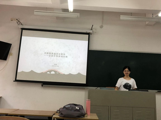 由翻译学研究中心主办的第59期“翻译学博士生论坛”于2019年6月15日14:00—16:00在六教B206举行,本次论坛的主题为:汉英信息虚实互变论——以涉外导译词为例。本次论坛由18级翻译学博士生张潇主讲,翻译学研究中心专职研究员曾利沙教授应邀出席。论坛参与人还包括高翻学院、英文学院、商英学院博士生等。