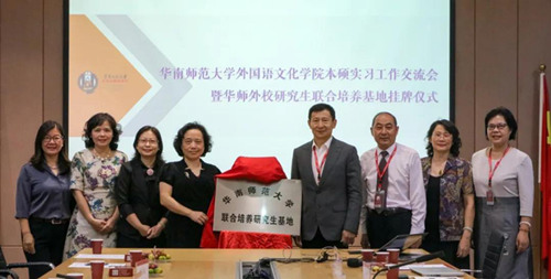 2020年10月15日下午,我院本硕实习工作交流会暨华南师范大学联合培养研究生基地授牌仪式在华师附属外国语学校举行。华南师范大学研究生院副院长安宁、教务处副处长赵艺、外文学院副院长黄丽燕、徐曼菲、外文学院学科教学方向硕导团队以及华师附属外国语学校总校长朱子平、副校长任怀柱、同文教育研究院专家、实习指导老师和实习生出席了本次活动。