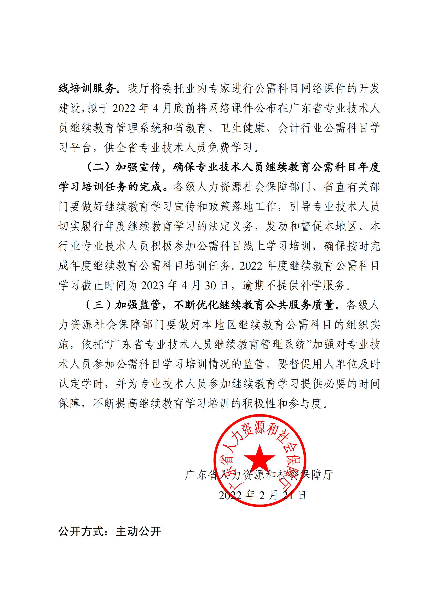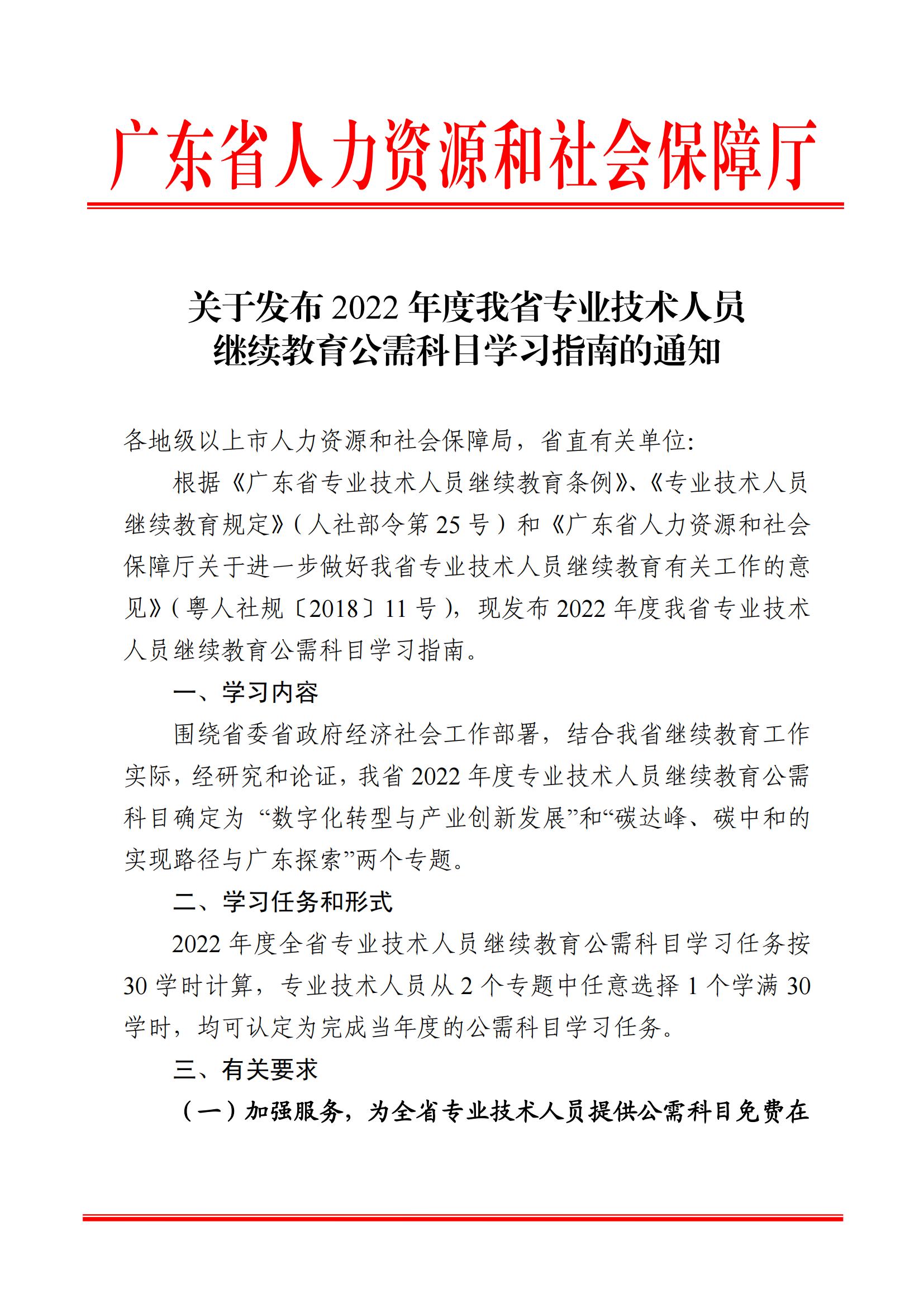 广东省人力资源和社会保障厅《关于发布2022年我省专业技术人员继续教育公需科目学习指南的通知》