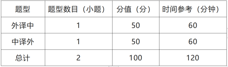 满分为100分,时间为120分钟,共2种题型2道题,全部为主观题。参赛选手可使用中译外、外译中纸质版词典各1本。