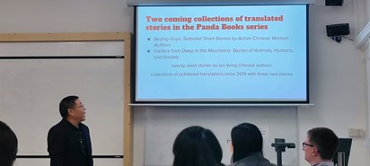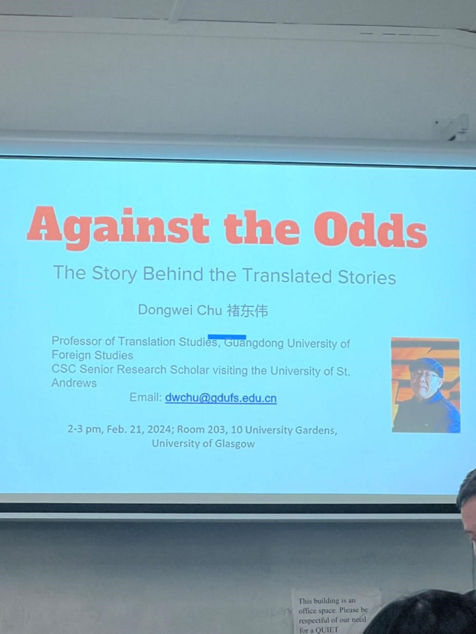 2024年2月21日下午2点至3点,广东外语外贸大学翻译学教授、国家留学基金委高级访问学者褚东伟教授在格拉斯哥大学现代语言与文化学院10号大学花园203室举办了一场题为《知难而进:翻译故事背后的故事》的讲座,由格拉斯哥大学翻译学高级讲师乔纳森·埃文斯博士主持,吸引了不少对中国文学英译感兴趣的师生前来聆听。