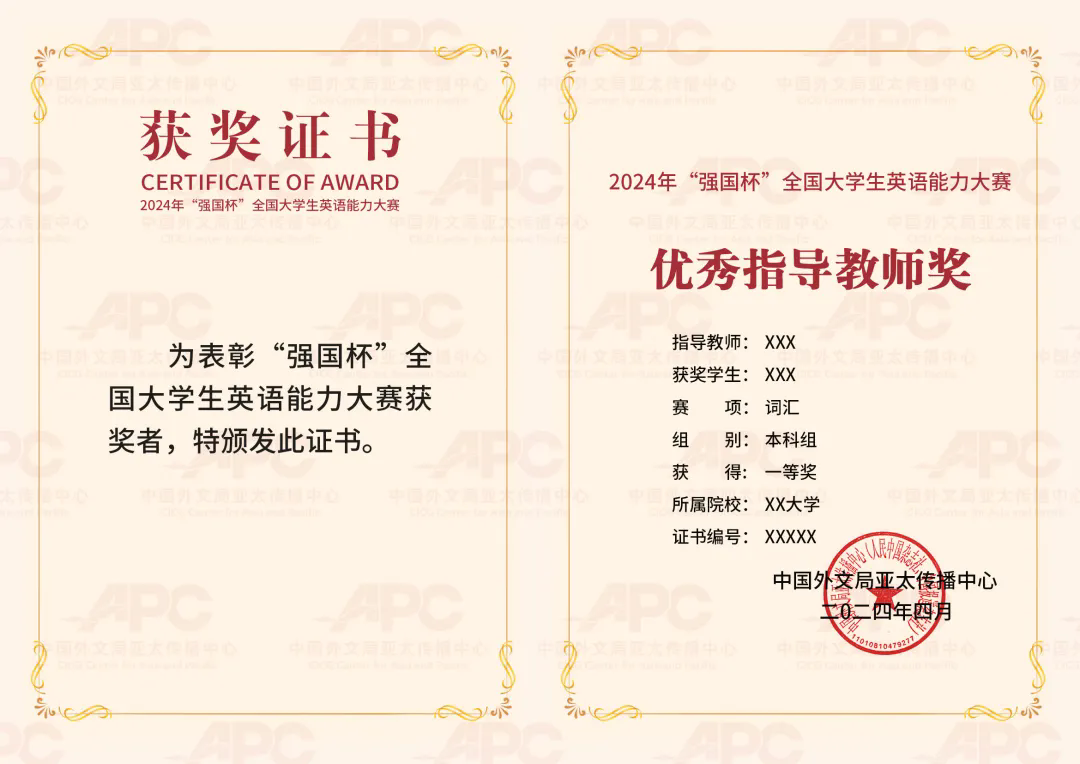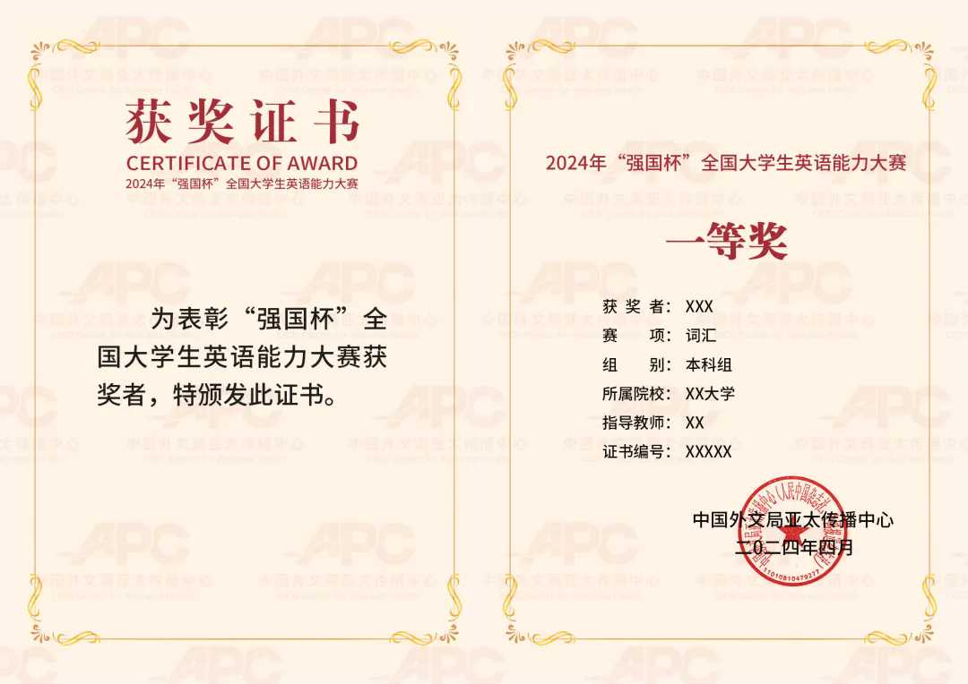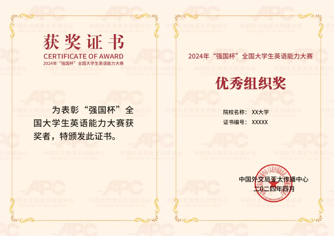 获奖选手/教师/单位将获得由中国外文局亚太传播中心颁发的荣誉证书。